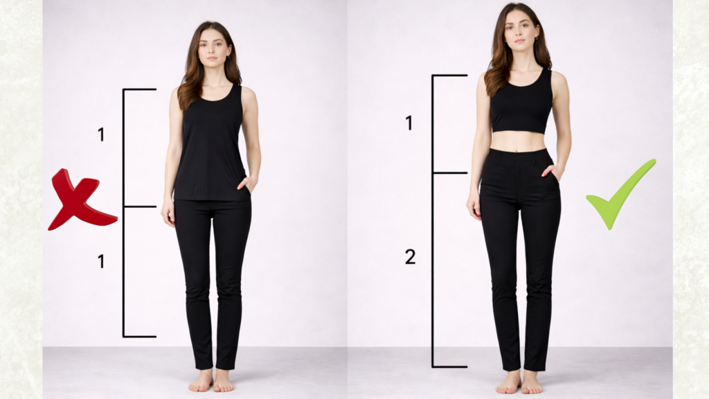 In practical terms, this means your top should hit around your belly button, while your bottoms extend below your knee. That creates the ideal one-third to two-thirds proportion.